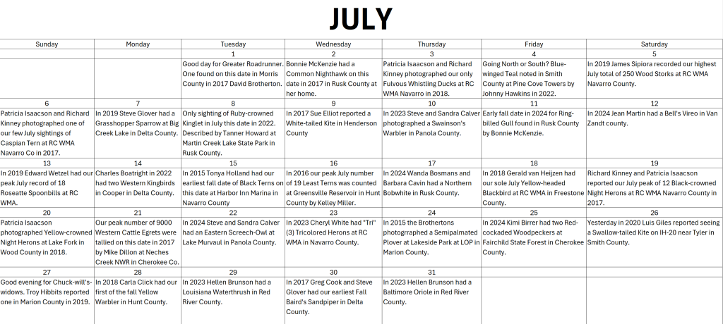 Each month I will be posting a calendar showing entries with arrival dates for various birding species. This will include the person making the report, where it was seen, and in what year.